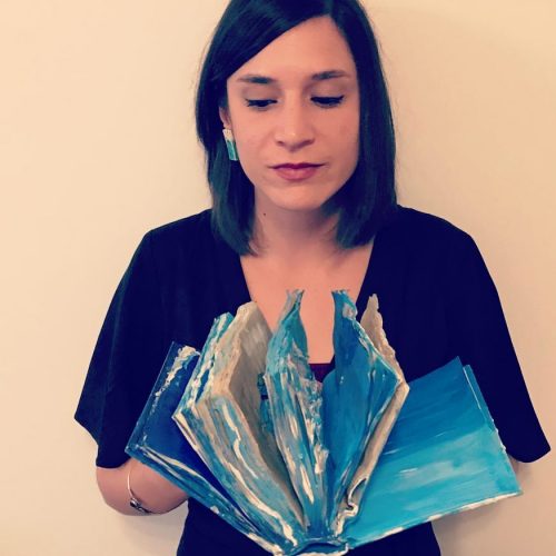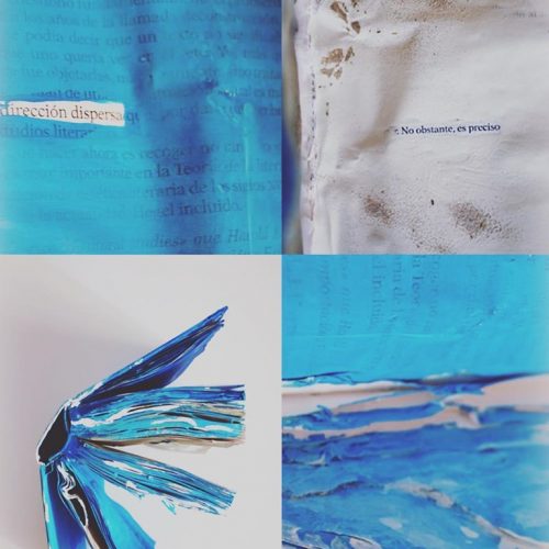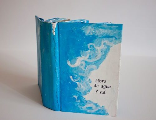 El libro de agua y sal, es un libro intervenido; se seleccionaron palabras y textos específicos para hacer un imaginario en torno al mar, también, se trató de manera plástica por medio de texturas y colores, ocultando parte del libro, y dándole otro sentido a determinados textos.